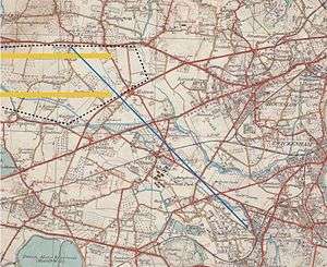 The first task of any survey is to establish a baseline location and, after a search by Roy and three other members of the Royal Society on 16 April, they fixed upon Hounslow Heath, an approximately level piece of ground between King's Arbour (now located within the confines of Heathrow airport) and Hampton Poor-house just over 5 miles to the south-east. The direction of the baseline was first chosen to suit the lie of the land, but it was seen to almost coincide with the telescopic view toward the steeple of All Saints' church in Banstead, approximately 12 miles away, and the baseline was therefore made to coincide exactly with that direction: it is shown as a dashed line on the map of the survey, below.