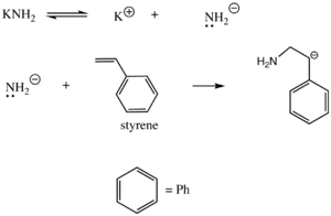 Szwarc and coworkers studied the initiation of polymerization through the use of aromatic radical-anions such as sodium naphthenate.[7] In this reaction, an electron is transferred from the alkali metal to naphthalene. Polar solvents are necessary for this type of initiation both for stability of the anion-radical and to solvate the cation species formed.[7] The anion-radical can then transfer an electron to the monomer.