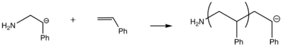 Anionic addition polymerization is a form of chain-growth polymerization or addition polymerization that involves the polymerization of vinyl monomers with strong electronegative groups.[3][4] This polymerization is carried out through a carbanion active species.[5] Like all chain-growth polymerizations, it takes place in three steps: chain initiation, chain propagation, and chain termination. Living polymerizations, which lack a formal termination pathway, occur in many anionic addition polymerizations. The advantage of living anionic addition polymerizations is that they allow for the control of structure and composition.[3][4]
