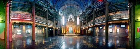 Sarah Jessica Parker and Matthew Broderick were married there in 1997.[10][20] Mandy Patinkin's Mamaloshen was also performed there, and Nobel Prize winner Elie Wiesel, poet Maya Angelou, playwright Arthur Miller, actress Tyne Daly, composer Philip Glass, and singers Whitney Houston and Mariah Carey have performed there.[7][10][15] In 2003, Avril Lavigne recorded her music video for "Losing Grip" there with Liz Friedlander as the director. Taking Back Sunday's live acoustic album Live from Orensanz was recorded here in 2010. It was the venue for the 2011 live recording of MTV Unplugged by Florence + The Machine. In 2015, Venture Opera staged three performances of Mozart's opera Don Giovanni at the Orensanz Center.[21] The same year, the Center was used in the filming of an episode of Jessica Jones.[22]