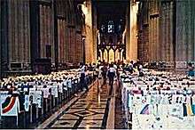 The interfaith service for peace and nuclear disarmament, held on August 3 at the Washington National Cathedral, was attended by 5,000 people. Cathedral staff reported that it was the second-largest crowd ever hosted in the building.[49] Over 4,000 handmade cloth panels were on display during the service. Each pew was decorated by The Ribbon International group, and additional cloth ribbons were draped and tied in various locations around the building. Twenty bagpipers in Highland dress led a procession of 200 people carrying ribbons into the cathedral. The service also included dancing, meditation, and a performance by the Howard University Gospel Choir.[50][51] Survivors of the Hiroshima and Nagasaki bombings were in attendance both at the church service and during The Ribbon event the next day.