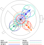 Evans, Carman, and Thorndike published a solution with significant differences from Wright's.[40] Their proposal centred on what they observed as irregular spacing of the inscriptions on the front dial face, which to them seemed to indicate an off-centre sun indicator arrangement; this would simplify the mechanism by removing the need to simulate the solar anomaly. They also suggested that rather than accurate planetary indication (rendered impossible by the offset inscriptions) there would be simple dials for each individual planet showing information such as key events in the cycle of planet, initial and final appearances in the night sky, and apparent direction changes. This system would lead to a much simplified gear system, with much reduced forces and complexity, as compared to Wright's model.[40]