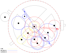 The inferior planet mechanism includes the sun (treated as a planet in this context), Mercury, and Venus.[6] For each of the three systems there is an epicyclic gear whose axis is mounted on b1, thus the basic frequency is the Earth year (as it is, in truth, for epicyclic motion in the sun and all the planets—excepting only the moon). Each meshes with a gear grounded to the mechanism frame. Each has a pin mounted, potentially on an extension of one side of the gear that enlarges the gear, but doesn't interfere with the teeth; in some cases the needed distance between the gear's centre and the pin is farther than the radius of the gear itself. A bar with a slot along its length extends from the pin toward the appropriate coaxial tube, at whose other end is the object pointer, out in front of the front dials. The bars could have been full gears, although there is no need for the waste of metal, since the only working part is the slot. Also, using the bars avoids interference between the three mechanisms, each of which are set on one of the four spokes of b1. Thus there is one new grounded gear (one was identified in the wreckage, and the second is shared by two of the planets), one gear used to reverse the direction of the sun anomaly, three epicyclic gears and three bars/coaxial tubes/pointers, which would qualify as another gear each. Five gears and three slotted bars in all.[6]