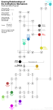 A schematic representation of the gearing of the Antikythera Mechanism, including the 2012 published interpretation of existing gearing, gearing added to complete known functions, and proposed gearing to accomplish additional functions, namely true sun pointer and pointers for the five then-known planets, as proposed by Freeth and Jones, 2012.[6] Based also upon similar drawing in the Freeth 2006 Supplement[31] and Wright 2005, Epicycles Part 2.[41] Proposed (as opposed to known from the artefact) gearing crosshatched.