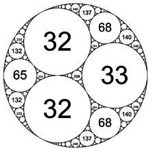 - ↑ Ronald L. Graham, Jeffrey C. Lagarias, Colin M. Mallows, Alan R. Wilks, and Catherine H. Yan; "Apollonian Circle Packings: Number Theory" J. Number Theory, 100 (2003), 1-45