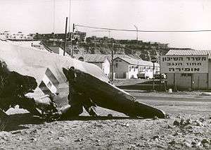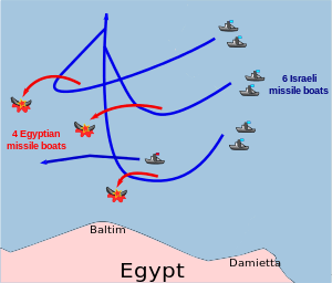Simultaneously, 14 Egyptian Tupolev Tu-16 bombers attacked Israeli targets in the Sinai with Kelt missiles, while another two Egyptian Tupolevs fired two Kelt missiles at a radar station in central Israel.[115] One missile was shot down by a patrolling Israeli Mirage fighter, and the second fell into the sea. The attack was an attempt to warn Israel that Egypt could retaliate if it bombed targets deep in Egyptian territory.[118]
