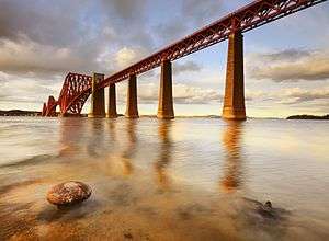 The most important engineering project was the Forth Bridge, a cantilever railway bridge over the Firth of Forth in the east of Scotland, 14 kilometres (9 mi) west of central Edinburgh. Construction of a suspension bridge designed by Thomas Bouch (1822–80), was stopped after the collapse of another of his works, the Tay Bridge.[46] The project was taken over by John Fowler (1817–98) and Benjamin Baker (1840–1907), who designed a structure that was built by Glasgow-based company Sir William Arrol & Co. from 1883. It was opened on 4 March 1890, and spans a total length of 2,528.7 metres (8,296 ft). It was the first major structure in Britain to be constructed of steel;[47] its contemporary, the Eiffel Tower was built of wrought iron.[48]