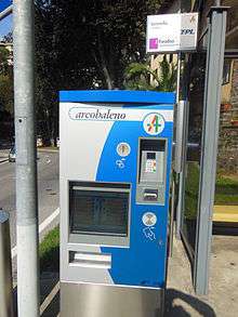 Arcobaleno offers various kinds of tickets, from single tickets to annual season tickets, which are valid on the buses, trains and boats of the operators that are members of the network. Tickets are only valid within the arcobaleno area, and a few operators have further restrictions on which tickets are accepted on which services. Ticket prices are based on zones, with 49 zones covering the whole of the arcobaleno area, whilst season tickets use a coarser zone structure of only 16 zones.[2]