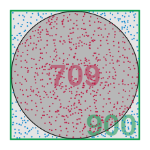 When more efficient methods of finding areas are not available, we can resort to “throwing darts”. This Monte Carlo method uses the fact that if random samples are taken uniformly scattered across the surface of a square in which a disk resides, the proportion of samples that hit the disk approximates the ratio of the area of the disk to the area of the square. This should be considered a method of last resort for computing the area of a disk (or any shape), as it requires an enormous number of samples to get useful accuracy; an estimate good to 10−n requires about 100n random samples (Thijsse 2006, p. 273).