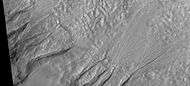 Close view of gullies from previous image The channels are quite curved. Because channels of gullies often form curves, it was thought that they were made by flowing water. Today, it is thought that they could be produced with chunks of dry ice. The image is from HiRISE under HiWish program.