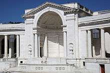 Memorial Amphitheater is an outdoor amphitheater, exhibit hall, and nonsectarian chapel located in Arlington National Cemetery in Arlington County, Virginia, in the United States. Designed in 1913 as a replacement for the older, wooden amphitheater near Arlington House, ground was broken for its construction in March 1915 and it was dedicated in May 1920. In the center of its eastern steps is the Tomb of the Unknowns, dedicated in 1921. It has served as the site for numerous Veterans Day and Memorial Day services, as well as for memorial services and funerals for many individuals.