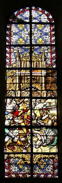 The earliest works of Arnold of Nijmegen in Gelderland, now in the Netherlands, are two cycles of windows in the transepts of Tournai Cathedral, both depicting important events in the history of the town.[5] One cycle depicts a sequence of events which took place in the 6th century, and led to the Cathedral of Tournai having the rights to collect tolls and taxes. The narratives which are depicted in the lower section of the windows show the defeat of King Chilperic by his brother Sigebert, the protection of Chilperic by the Bishop of Tournai, and the plotting and assassination of Sigebert by Chilperic's wife Queen Fredegund.[5] The upper sections of the same windows depict various aspects of taxation and toll collection by the clergy of Tournai Cathedral.[5] The second cycle tells how the city, having been annexed to Noyon, gained favour with Pope Eugene III through the influence of Bernard of Clairveaux and regained its rights.[5]