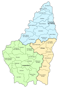Arrondissement of Largentière in green, Privas in yellow, Tournon-sur-Rhône in blue