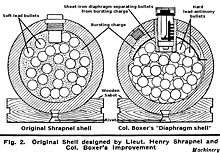 - ↑ "The action of Boxer-shrapnel is well known. The fuze fires the primer, which conveys the flash down the pipe to the bursting charge, the explosion of which breaks up the shell, and liberates the balls". Treatise on Ammunition 1887, p. 216.