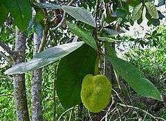 The appearance of the fruit can be regarded as an intermediate shape between the jackfruit and the breadfruit. It is round to oblong, 15–20 cm long and 13 cm broad, and weighing about 1 kg. The thick rind is covered with soft, broad spines. They become hard and brittle as the fruit matures. When fully mature the expanding arils stretch the outer rind which often appears lumpy, especially if not all seeds were pollinated. The fruit does not fall to the ground until over-ripe. It may be harvested when full size but still firm, and left to ripen until soft. Fruits change colour to greenish yellow when ripe. The ripe fruit is opened by cutting the rind around, twisting and gently pulling. If overripe they are simply pulled apart. The interior of the fruit is somewhat similar to the jackfruit's, but the color is white and the flesh is usually softer. The core is relatively large, but there are far fewer "rags" and less non-edible parts. Arils are white and the size of a grape, each containing a 15 × 8 mm seed. Once opened, the fruit should be consumed quickly (in a few hours), as it loses flavour rapidly and fruit oxidizes. The seeds are also edible after boiling or roasting.