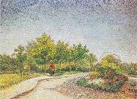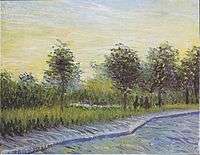 Longing for tranquil settings,[6] van Gogh began to paint in Asnières in April 1887 where fellow artists Signac and Bernard lived.[2] Beyond the city fortifications and along the banks of the Seine, lay Asnières and the island of Grand Jatte. He experimented with a lighter, more colorful palette than used in his early Dutch and Montmartre paintings.[8] When painting with Bernard, they often painted in the open air. To his sister Wil, Vincent wrote, "While painting at Asnières, I saw more colors than I have ever seen before." Instead of working in the somber colors of his early work, he embraced the use of color and light of the Impressionists.[5] Also influenced by Pointillism, van Gogh modified his traditional style and used vivid color, shorter brushstrokes and perspective to engage the viewer. His views of the banks of the Seine are an important progression for his later landscape paintings.[2][9] In Asnières, within walking distance of Theo's flat in Montmartre, Vincent painted parks, cafés, restaurants and the river.[10]