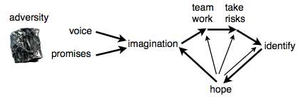 Dr. Barbara L. Fredrickson argues that hope comes into its own when crisis looms, opening us to new creative possibilities.[4] Frederickson argues that with great need comes an unusually wide range of ideas, as well as such positive emotions as happiness and joy, courage, and empowerment, drawn from four different areas of one’s self: from a cognitive, psychological, social, or physical perspective.[5] Hopeful people are "like the little engine that could, [because] they keep telling themselves "I think I can, I think I can".[6] Such positive thinking bears fruit when based on a realistic sense of optimism, not on a naive "false hope".[7]