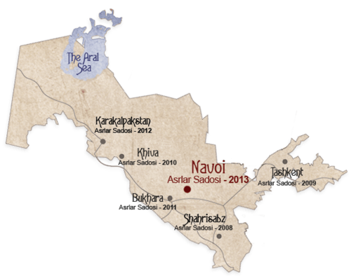 Being held annually since 2008, Asrlar Sadosi takes place in different regions of Uzbekistan in historical or cultural centers as an outdoor event. The first festival was held near Shakhrisabz, the next one took place in Akkurgan and Bostanlik districts, Tashkent Region, and was organised in association with UNESCO. In 2010, Khiva was a host city of the festival which was held in the historical architectural complex Ichan-Qala.[2] In 2011 another well known historical city of Uzbekistan, Bukhara, hosted Asrlar Sadosi. In 2012 the festival took place in Tuproq Qala ancient fortress in Ellikqala District of Karakalpakstan.[3]
