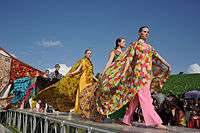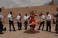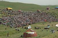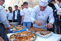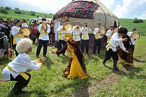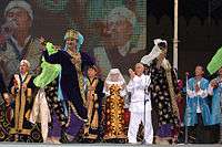 This year's highlight was an exhibition of Akhal-Teke horses, whose beauty, grace and skills had been charming people around the world for 5,000 years.[15] Scores of motley yurts, pavilions and cafes offering national culinary delights were mounted at the foot of the Tuproq Qala citadel while young lads dressed like warriors were standing as historical guards on top of the old walls of the fortress along its perimeter.[16]