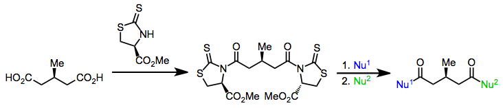 Nonenzymatic methods for the differentiation of enantiotopic groups employ chiral catalysts or auxiliaries. For instance, the introduction of a chiral leaving group on both carboxylic acid groups of a meso diacid leads to selective attack by an achiral nucleophile at one of the (now) diastereotopic carbonyl groups.[20]
