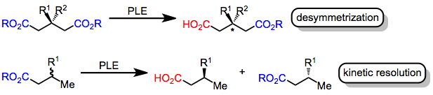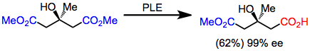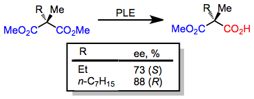 Pig liver esterase (PLE) is a widely used enzyme for asymmetric ester hydrolysis. Although it was originally used for the desymmetrizing hydrolysis of glutarate esters,[3] PLE also hydrolyzes malonates, cyclic diesters, monoesters, and other substrates. Active site models have been advanced to explain the selectivity of PLE.[4]