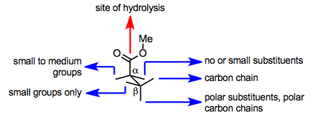 3-Alkyl glutarates with small alkyl substituents are hydrolyzed to the (R)-monoester; however, when a large alkyl substituent is present, the (S)-monoester forms.[6] This switch in enantioselectivity is accurately predicted by the active site model given above.