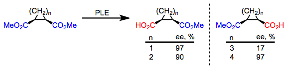 A number of meso diesters other than the substrates described above may be hydrolyzed by PLE with high enantioselectivity. Cyclic meso diesters tend to be hydrolyzed more selectively than acyclic diesters.[8] The predominant enantiomer of product depends on ring size.[9][10]