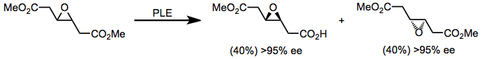 Racemic mixtures of all of the substrates described above, as well as additional chiral diesters (such as the epoxy ester in equation (8)), may be resolved using PLE for kinetic resolution.[12] A significant disadvantage of kinetic resolution is a maximum yield of hydrolyzed product of 50%. However, if rapid racemization is occurring alongside hydrolysis (an example of dynamic kinetic resolution), a maximum yield of 100% is possible.[13]