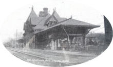 The original Boston and Providence Railroad station, a complex Victorian Gothic building, was located north of Mill Street at a grade crossing.[3] Service began in June 1835 from Boston to Providence. Two branches opened from Attleboro: The Attleboro Branch Railroad (run by the B&P) opened in January 1870, followed by the New Bedford and Taunton Railroad's Attleboro Branch (to Taunton) in August 1871.[4]