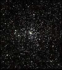 M36 (NGC 1960) is a young galactic open cluster with approximately 60 stars, most of which are relatively bright; however, only about 40 stars are visible in most amateur instruments.[85] It is at a distance of 3,900 light-years and has an overall magnitude of 6.0; it is 14 light-years wide.[10][17][40] Its apparent diameter is 12.0 arcminutes.[85] Of the three open clusters in Auriga, M36 is both the smallest and the most concentrated, though its brightest stars are approximately 9th magnitude.[11] It was discovered in 1749 by Guillaume Le Gentil, the first of Auriga's major open clusters to be discovered. M36 features a 10-arcminute-wide knot of bright stars in its center, anchored by Struve 737, a double star with components separated by 10.7 arcseconds. Most of the stars in M36 are B type stars with rapid rates of rotation.[40] M36's Trumpler class is given as both I 3 r and II 3 m. Besides the central knot, most of the cluster's other stars appear in smaller knots and groups.[85]