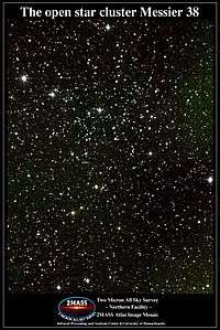 M38 is a diffuse open cluster at a distance of 3,900 light-years, the least concentrated of the three main open clusters in Auriga;[40] it is classified as a Trumpler Class II 2 r or III 2 r cluster because of this.[85] It appears as a cross-shaped or pi-shaped object in a telescope and contains approximately 100 stars;[40] its overall magnitude is 6.4.[10][11] M38, like M36, was discovered by Guillaume Le Gentil in 1749. It has an apparent diameter of approximately 20 arcseconds and a true diameter of about 25 light-years. Unlike M36 or M37, M38 has a varied stellar population. The majority of the population consists of A and B type main sequence stars, the B type stars being the oldest members, and a number of G type giant stars. One yellow-hued G type star is the brightest star in M38 at a magnitude of 7.9.[40] The brightest stars in M38 are magnitude 9 and 10.[85] M38 is accompanied by NGC 1907, a smaller and dimmer cluster that lies half a degree south-southwest of M38; it is at a distance of 4,200 light-years.[17] The smaller cluster has an overall magnitude of 8.2 and a diameter of 6.0 arcminutes, making it about a third the size of M38. However, NGC 1907 is a rich cluster, classified as a Trumpler Class I 1 m n cluster. It has approximately 12 stars of magnitude 9–10, and at least 25 stars of magnitude 9–12.[85]