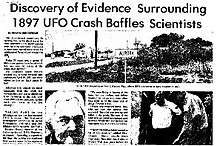 One of these accounts appeared in the April 19, 1897, edition of the Dallas Morning News. Written by Aurora resident S.E. Haydon,[2] the alleged UFO is said to have hit a windmill on the property of a Judge J.S. Proctor two days earlier at around 6am local (Central) time,[3] resulting in its crash. The pilot (who was reported to be "not of this world", and a "Martian" according to a reported Army officer from nearby Fort Worth)[4] did not survive the crash, and was buried "with Christian rites" at the nearby Aurora Cemetery. (The cemetery contains a Texas Historical Commission marker mentioning the incident.[5])