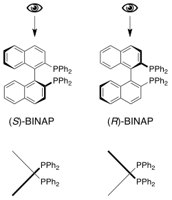 Axial chirality is a special case of chirality in which a molecule does not possess a stereogenic center (the most common form of chirality in organic compounds) but an axis of chirality – an axis about which a set of substituents is held in a spatial arrangement that is not superposable on its mirror image. Axial chirality is most commonly observed in atropisomeric biaryl compounds wherein the rotation about the aryl-aryl bond is restricted, for example, biphenyl, binaphthyls, e.g., 1,1'-bi-2-naphthol, and certain dihydroanthracenone compounds.[1] Certain allene compounds and spirans also display axial chirality. The enantiomers of axially chiral compounds are usually given the stereochemical labels Ra and Sa.[2] The designations are based on the same Cahn-Ingold-Prelog priority rules used for tetrahedral stereocenters. The chiral axis is viewed end-on and the two "near" and two "far" substituents on the axial unit are ranked, but with the additional rule that the near substituents have higher priority than the far ones.