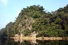 Ba Bể National Park, established in 1992, covers an area of 100.48 square kilometres (38.80 sq mi), delimited within geographical coordinates of 22°24′19″N 105°36′55″E / 22.40528°N 105.61528°E. It was set up to protect the Ba Bể Lake along with its surrounding limestone and lowland evergreen forests. The South-West valley of Phiabyior Range of the park has mountain peaks with an elevation range of 517–1,525 m.[16] The reserve forest has two main types of forest vegetation namely the limestone and lowland evergreen forests. The limestone forest, the larger of the two types in the reserve has steep limestone slopes with shallow soil cover. The forest species recorded are mostly Burretiodendron hsienmu and Streblus tonkinensis. The other type is the lowland evergreen forest shallow slopes with a thicker mantle of soils. It has a rich ground flora with a higher diversity of tree species.[17]