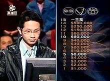 Baak Maan Fu Yung (Chinese: 百萬富翁, Cantonese Yale: baak3 maan6 fu3 yung1, Jyutping: baak3 maan6 fu3 jung1, literally The Millionaire, also had the English words of Who Wants to Be a Millionaire surrounding the Chinese title) was a game show from Hong Kong, based on the original British format of Who Wants to Be a Millionaire?. The show's host was Kenneth Chan. The main goal of the game was to win 1 million Hong Kong dollars (US$129,000) by answering 15 multiple-choice questions correctly. There were three lifelines: 50:50, Phone-a-Friend and Ask-the-Audience. Baak Maan Fu Yung first aired on April 30, 2000. It was broadcast by Hong Kong's ATV.