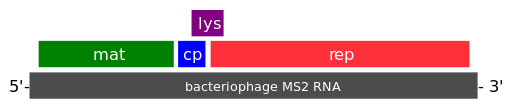 The MS2 genome is one of the smallest known, consisting of 3569 nucleotides of single-stranded RNA.[4] It encodes just four proteins: the maturation protein (A-protein), the lysis protein, the coat protein, and the replicase protein.[1] The gene encoding lysis protein (lys) overlaps both the 3'-end of the upstream gene (cp) and the 5'-end of the downstream gene (rep), and was one of the first known examples of overlapping genes. The positive-stranded RNA genome serves as messenger RNA, and is translated upon viral uncoating within the host cell. Although the four proteins are encoded by the same messenger/viral RNA, they are not all expressed at the same levels; expression of these proteins is regulated by a complex interplay between translation and RNA secondary structure.