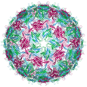 An MS2 virion (viral particle) is about 27 nm in diameter, as determined by electron microscopy.[8] It consists of one copy of the maturation protein and 180 copies of the coat protein (organized as 90 dimers) arranged into an icosahedral shell with triangulation number T=3, protecting the genomic RNA inside.[9] The virion has an isoelectric point (pI) of 3.9.[10]