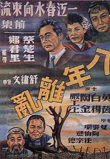 After the end of World War II, Bai Yang returned to Shanghai and starred in her two most famous films: Eight Thousand Li of Cloud and Moon (directed by Shi Dongshan) and The Spring River Flows East (directed by Cai Chusheng and Zheng Junli), both dealing with the trauma of the war. Her performance in the latter, in which she played a factory worker abandoned by her patriot husband who turned into a factory owner, was considered her career landmark. The film broke all Chinese records and has been considered by some as China's Gone with the Wind.[2] She also starred in Shi Dongshan's The Sorrows of a Bride (1948) and Wu Zuguang's Tears of Mountains and Rivers (1949).[3]