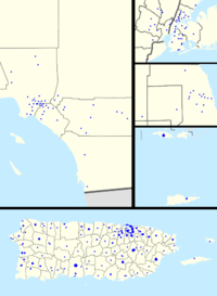 Footprint of Popular, Inc. branches. On the bottom, Puerto Rico; on the upper left, Greater Los Angeles; on the right, from top to bottom: Greater New York City (including New Jersey), Greater Chicago, and the US Virgin Islands. Not to scale.