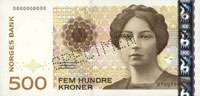 The 500 kroner note (1999) portrays Sigrid Undset (1882–1949), author and winner of the Nobel Prize in literature in 1927. The note features a holographic metal foil stripe and other security measures. The previous edition (1991), no longer valid, portrays Edvard Grieg (1843–1907), world-renowned national romantic composer and pianist.
