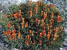 Banksia ericifolia, the heath-leaved banksia (also known as the lantern banksia or heath banksia), is a species of woody shrub of the Proteaceae family native to Australia. It grows in two separate regions of Central and Northern New South Wales east of the Great Dividing Range. Well known for its orange or red autumn inflorescences, which contrast with its green fine-leaved heath-like foliage, it is a medium to large shrub that can reach 6 m (20 ft) high and wide, though is usually half that size. In exposed heathlands and coastal areas it is more often 1–2 m (3.3–6.6 ft).