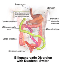 This complex operation is termed biliopancreatic diversion (BPD) or the Scopinaro procedure. The original form of this procedure is now rarely performed because of problems with malnourishment. It has been replaced with a modification known as duodenal switch (BPD/DS). Part of the stomach is resected, creating a smaller stomach (however the patient can eat a free diet as there is no restrictive component). The distal part of the small intestine is then connected to the pouch, bypassing the duodenum and jejunum.