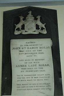 Lord Rollo, of Duncrub in the County of Perth, is a title in the Peerage of Scotland. It was created in 1651 for Sir Andrew Rollo. His great-great-grandson, the fifth Lord, was a Brigadier-General in the Army and fought in North America during the Seven Years' War. He died without surviving male issue and was succeeded by his younger brother, the sixth Lord. His grandson, the eighth Lord, sat in the House of Lords as a Scottish Representative Peer from 1841 to 1846. His son, the ninth Lord, was a Scottish Representative Peer from 1847 to 1852. His son, the tenth Lord, sat in the House of Lords as a Scottish Representative Peer from 1860 to 1868. In 1869 he was created Baron Dunning, of Dunning and Pitcairns in the County of Perth, in the Peerage of the United Kingdom. This title gave the Lords an automatic seat in the House of Lords. As of 2010 the titles are held by the tenth Lord's great-great-grandson, the fourteenth Lord, who succeeded his father in 1997. He is the hereditary Clan Chief of Clan Rollo.