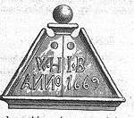 Workers discovered a cavity in one of the walls when the castle was being partially demolished in 1815;[22] this contained four small urns, a painted drinking glass and a large jaw bone, possibly of an ox. Two of the urns had handles and all were tightly closed with shreds or trimmings of woven cloth. One of the urns contained the breast and side bones of a chicken and the others a sort of greasy soil. A coin was found in the grounds near the old tower, bearing the legend 'FESTINA LENTE' ('Make Haste Slowly'); other details being too worn too make out.[23] No explanation has been put forward for these articles presence here.[24] A portion of the castle survives, about 20 feet long and 25 feet in height, forming the north elevation of the walled garden.[22] It has an elliptical gun port in it and a rectangular window. Some square bee bole recesses are also present.[20]