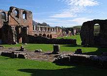 In the Middle Ages the Furness peninsula was controlled by the Cistercian monks of the Abbey of St Mary of Furness, known as Furness Abbey. This was located in the "Vale of Nightshade", now on the outskirts of the town.[10] Originally founded for the Savigniac order, it was built on the orders of King Stephen in 1123. Soon after the abbey's foundation the monks discovered iron ore deposits, later to provide the basis for the Furness economy. These thin strata, close to the surface, were extracted through open cut workings,[11] which were then smelted by the monks.[12] The proceeds from mining, along with agriculture and fisheries, meant that by the 15th century the abbey had become the second richest and most powerful Cistercian abbey in England, after Fountains Abbey in Yorkshire.[13] The monks of Furness Abbey constructed a wooden tower on nearby Piel Island in 1212 which acted as their main trading point; it was twice invaded by the Scots, in 1316 and 1322. In 1327 King Edward III gave Furness Abbey a licence to crenellate the tower, and a motte-and-bailey castle was built. However Barrow itself was just a hamlet in the parish of Dalton-in-Furness, reliant on the land and sea for survival. Small quantities of iron and ore were exported from jetties on the channel separating the village from Walney Island. Amongst the oldest buildings in Barrow are several cottages and farmhouses in Newbarns (now a ward of the borough) which date back to the early 17th century; as well as Rampside Hall, a Grade I listed building and the best-preserved in the town from the 1600s. Even as late as 1843 there were still only 32 dwellings, including two pubs.[14]