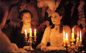 According to critic Tim Robey, the film has a "stately, painterly, often determinedly static quality."[9] For example, to help light some interior scenes, lights were placed outside and aimed through the windows, which were covered in a diffuse material to scatter the light evenly through the room rather than being placed inside for maximum use as most conventional films do. A sign of this method occurs in the scene where Barry duels Lord Bullingdon. Though it appears to be lit entirely with natural light, one can see that the light coming in through the cross-shaped windows in the tithe barn appears blue in color, while the main lighting of the scene coming in from the side is not. This is because the light through the cross-shaped windows is daylight from the sun, which when recorded on the film stock used by Kubrick showed up as blue-tinted compared to the incandescent electric light coming in from the side.
