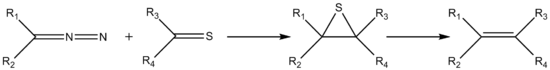 In the reaction mechanism for this reaction the diazo compound is a 1,3-dipole which reacts with the thioketone in a 1,3-dipolar cycloaddition to a thiadiazoline. This intermediate is unstable and through nitrogen gas expulsion and formation of an intermediate thiocarbonyl ylide it forms a stable episulfide. Triphenylphosphine opens the three-membered ring and then forms a sulfaphosphatane in a manner similar to the Wittig reaction. In the final step triphenylphosphine sulfide is expulsed liberating the alkene.