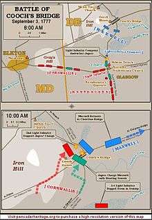 The battle lasted for much of the day; at Cooch's Bridge, Maxwell's men made a stand until they "had shot themselves out of ammunition" and "the fight was carried on with the sword" and bayonet (the latter being a weapon Maxwell's militia lacked experience in using).[17][18] After seven hours of fighting, the Americans were forced to retreat from Iron Hill across Cooch's Bridge, taking up a position on the far side. Howe ordered the 1st and 2nd British Light Infantry Battalion to assist the jägers in taking the bridge. While the 1st Battalion under Robert Abercromby became mired in swampy terrain attempting to ford the Christina River, the 2nd Battalion reached the right of the jägers and the bridge was taken. Maxwell's army then retreated back toward Wilmington.[1]