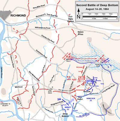The Second Battle of Deep Bottom, also known as Fussell's Mill (particularly in the South), New Market Road, Bailey's Creek, Charles City Road, or White's Tavern was fought August 14–20, 1864, at Deep Bottom in Henrico County, Virginia, during the Richmond-Petersburg Campaign (Siege of Petersburg) of the American Civil War.