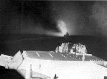 ![]() A Japanese aircraft crashes (upper center) into the ocean near the U.S. cruiser Columbia on 2 November 1943, during air attacks on Allied ships off Bougainville, a few hours after the Naval Battle of Empress Augusta Bay. | |||||||